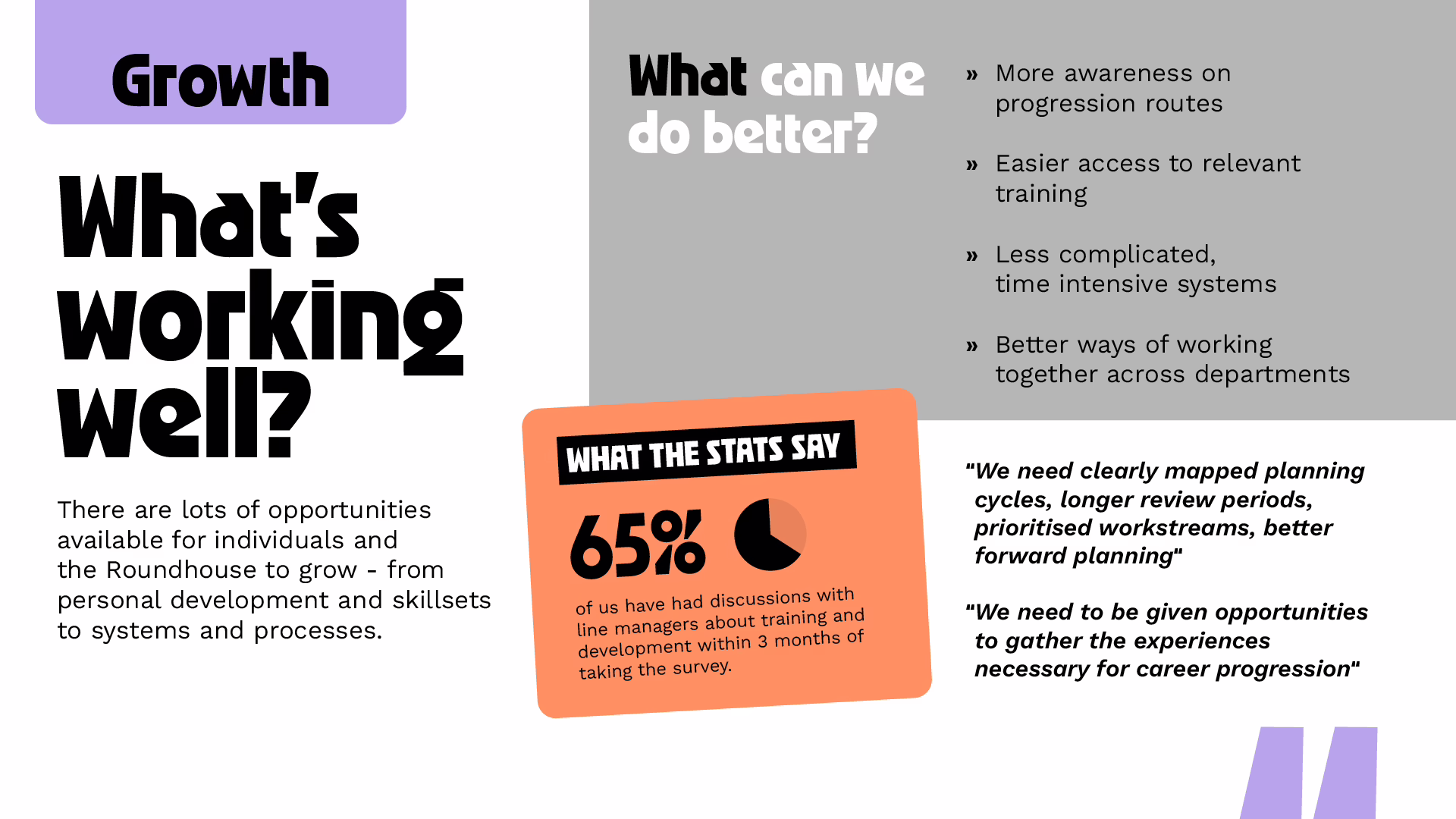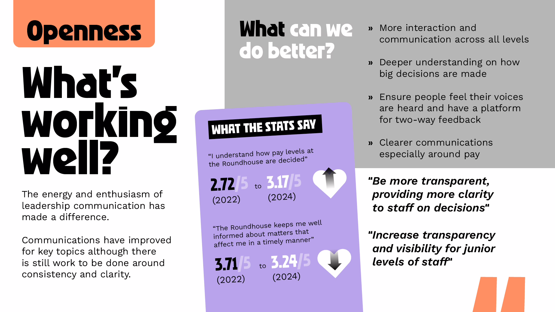 To empower the Roundhouse to drive meaningful change we provided them with everything they needed to embed the new cultural framework. This included leadership presentations and a cascade pack to encourage personal accountability around culture. We needed to shift the organisational mindset towards understanding that culture is something that we all contribute towards, every day. Together, we developed cultural pillars of connection, growth, openness and belonging as the foundations for success. We then supported the Roundhouse with a strategic communications plan to embed a culture everyone is proud of.